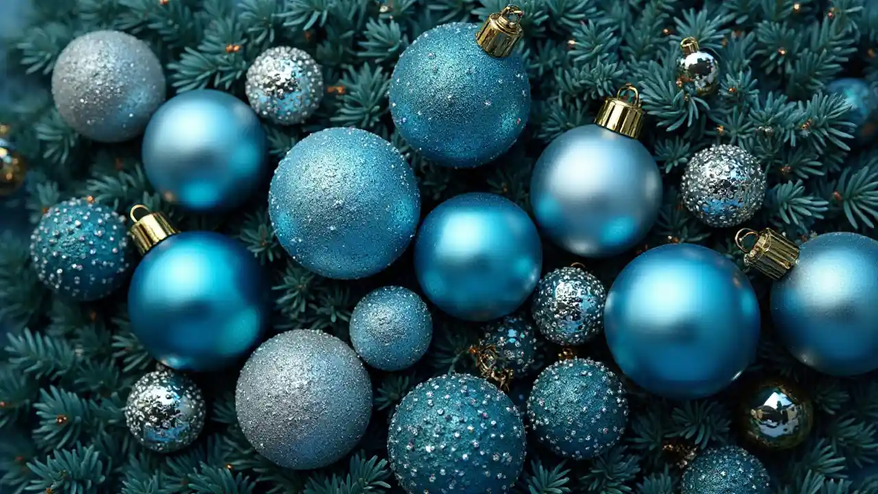 TinaBolas de Navidad azules y blancas de diferentes tamaños, muy juntas, en ramas de pino de color verde, vista superior