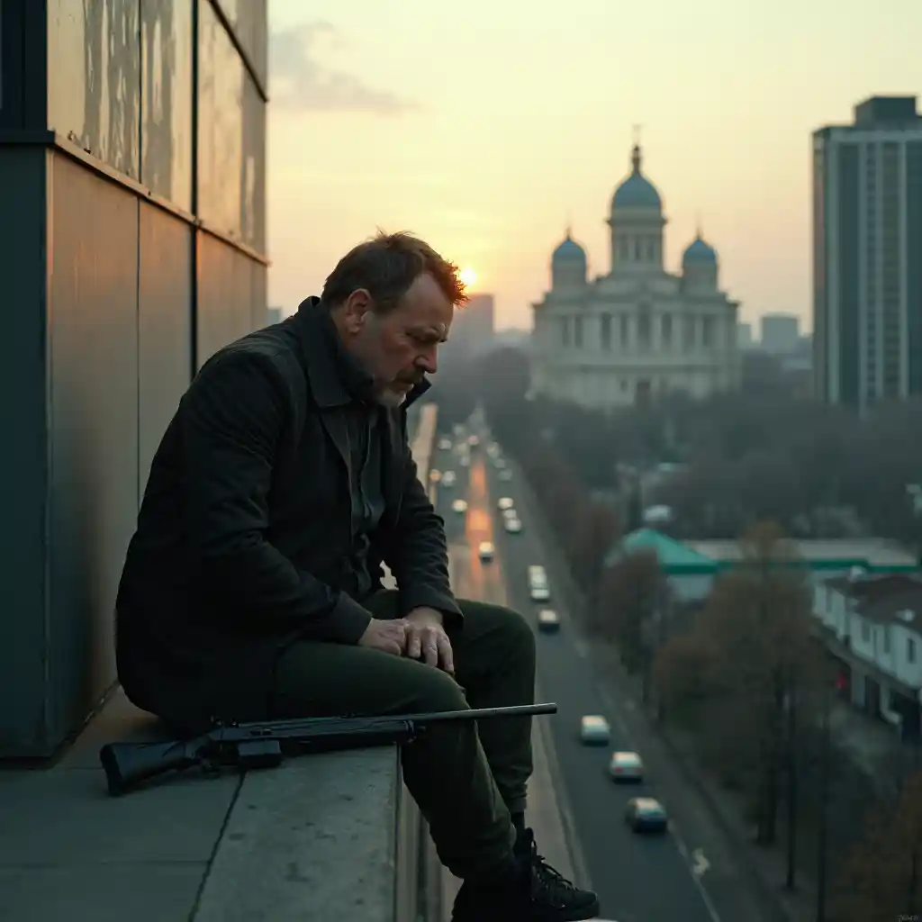 Foto cinemática ultra realista, gran angular, relación de aspecto 16:9: dos hombres: Man 1 se parece al actor Frank Kessler (https://de.wikipedia.org/wiki/Frank _ Kessler por favor preste atención al enlace a la entrada de Wikipedia sobre el actor alemán Frank Kessler, allí encontrará fotos de él) (esto es solo sobre el tipo Frank Kessler, no sobre la persona real)) y usa un atuendo moderno negro para el combate cuerpo a cuerpo de una unidad especial moderna. La persona dos también lleva un atuendo de combate cuerpo a cuerpo, pero en colores de camuflaje de ciudad verde militar. El hombre 2 se sienta en el borde de una terraza. Está agotado. Tiene un rifle de francotirador a su lado en el borde de la terraza. La persona 1 se inclina sobre él y le toca el pecho. La escena tiene lugar en una terraza en el piso 10 de un edificio de gran altura en Berlín. En el fondo se puede ver la Iglesia Memorial Kaiser Wilhelm y varios elementos del horizonte de la ciudad de Berlín-Oeste. A la derecha de la Iglesia Memorial se encuentra el rascacielos Upper West y a la derecha del Upper West se encuentra el rascacielos del Hotel Waldorf Astoria de Berlín. Es tarde, la puesta de sol se acerca. La atmósfera es amenazante Estilo cinematográfico: thriller político/película de acción --v 6 --ar 16:9 --estilo crudo --calidad 2 --iluminación cinematográfica suave --fotográfica --profundidad de campo --realismo --sin distorsiones --sin desenfoque --sin texto --sin marca de agua --sin doble cara