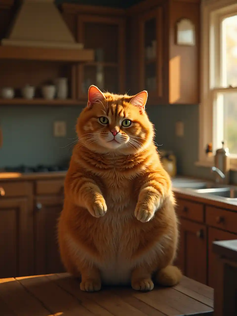 @+🌄🏋️♂️: Una imagen cinemática y realista de un gato naranja fatura con características refinadas, empuñando una cocina bañada en cálidos colores otoñales.