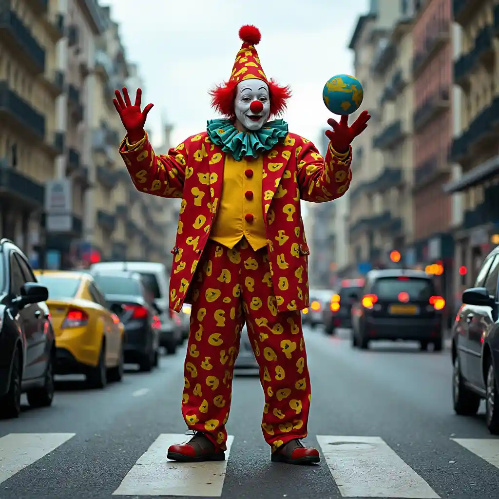 Un payaso cómico, vestido con ropa vibrante y de gran tamaño y una nariz roja brillante, que realiza trucos enérgicos y hace malabarismos en medio de una bulliciosa calle de la ciudad, para frustración de los conductores que tocan las bocinas tratando de navegar por la escena caótica, creando una interrupción humorística y caótica en medio del tráfico diario de la ciudad.