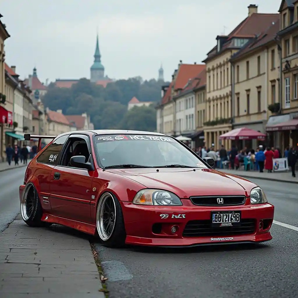 Honda Civic 6g de edad con carrera de arrastre, kit de carrocería y 1000 CV en Praga en el puente de Charles