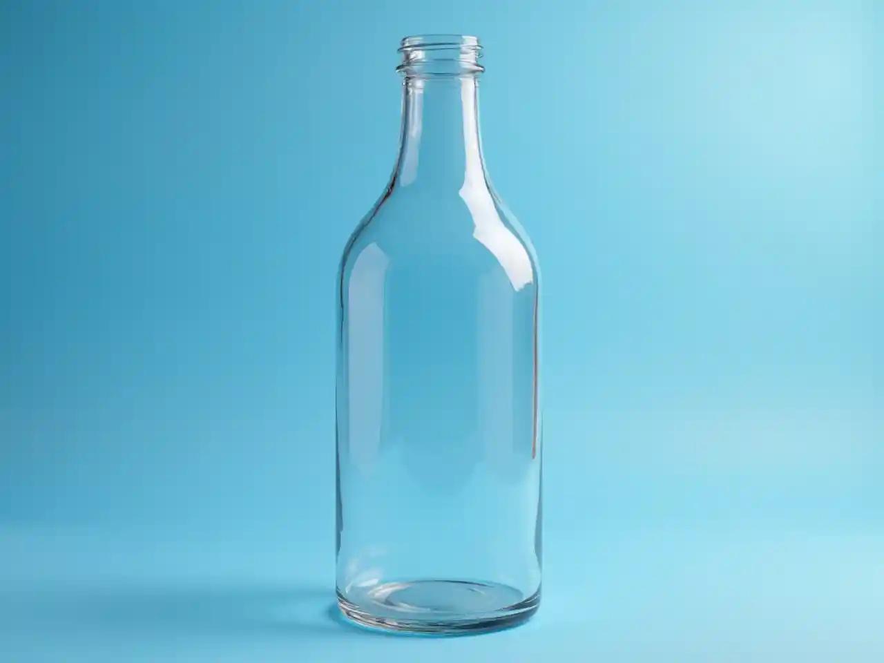 Rileyuna botella de vidrio transparente, vacía, limpia, clara, aislada, fondo azul
