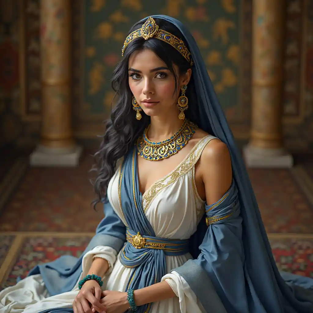 IsabellaLa reina Cleopatra lleva un vestido azul y blanco real