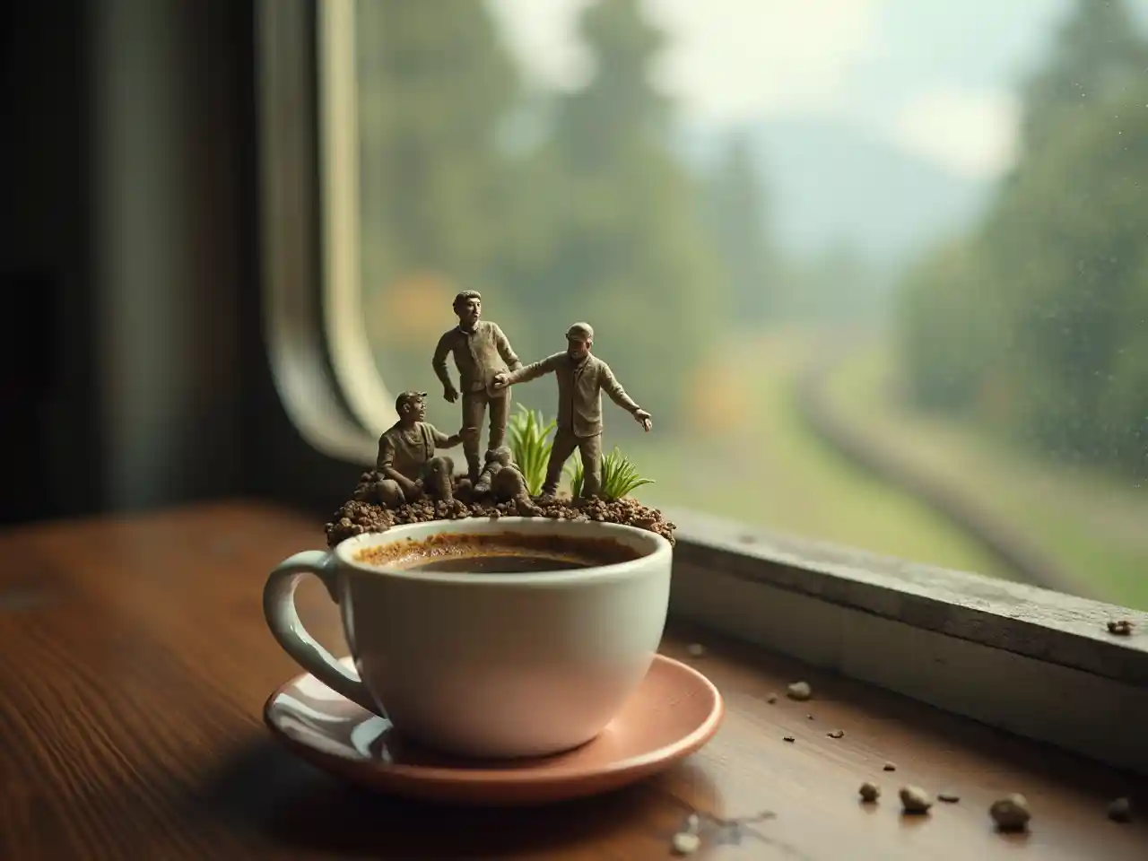 una taza de café contiene varios dioramas pequeños de humanos trepando, en una ventana de tren, alta calidad, 8K, mejor calidad
