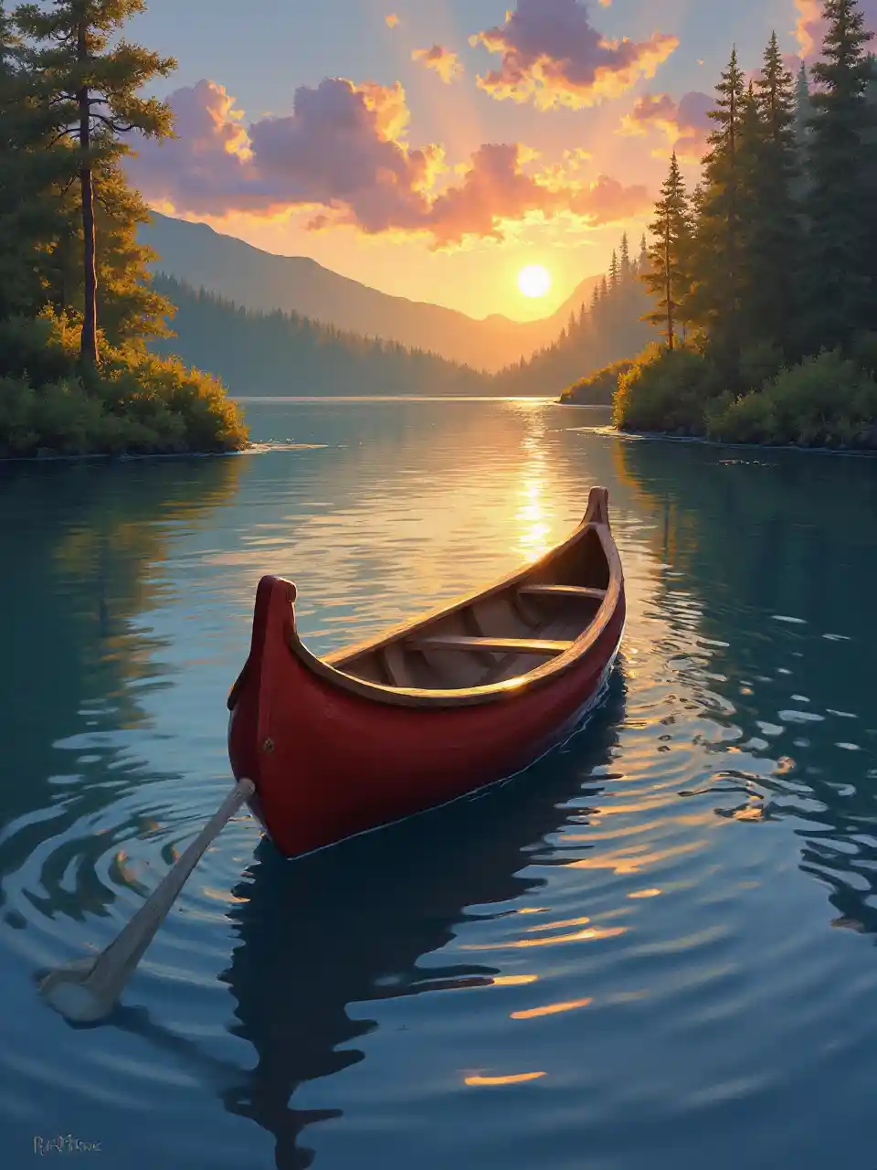 Crea una imagen de una pequeña y colorida canoa, flotando pacíficamente en un río tranquilo con una puesta de sol de fondo. El estilo debe ser fantasía, pintura al óleo similar a las obras de arte que se encuentran en el juego de cartas Magic: The Gathering. No incluya la firma de un artista ni ningún texto en la imagen.