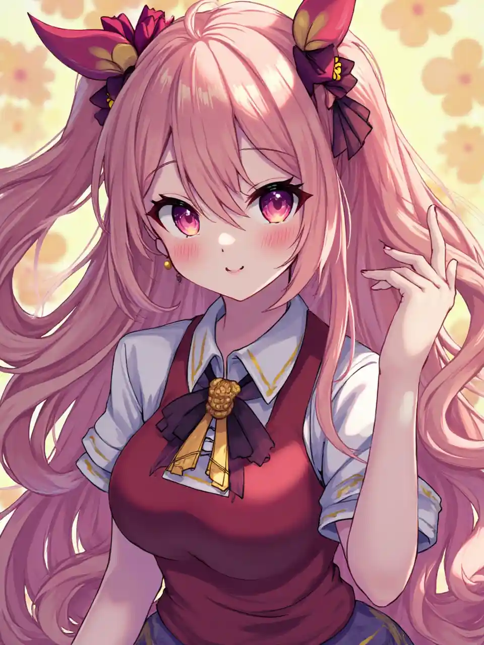 Dame un genshin oc que es paleta de color está lleno de rosa amarillo y púrpura