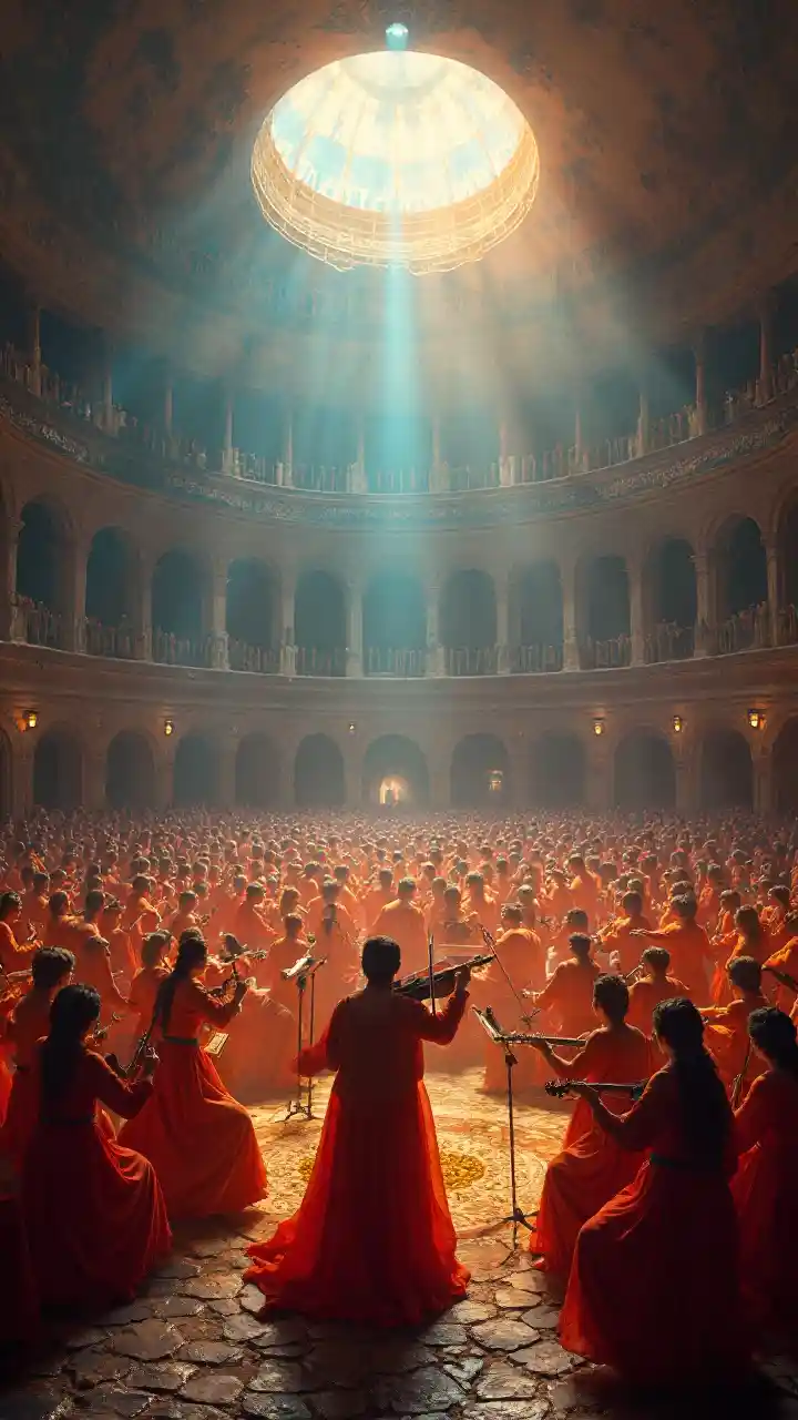 LunaCrear una Orquesta de mil personas con un aura vibrante tocando instrumentos con un coro en el centro del Coliseo