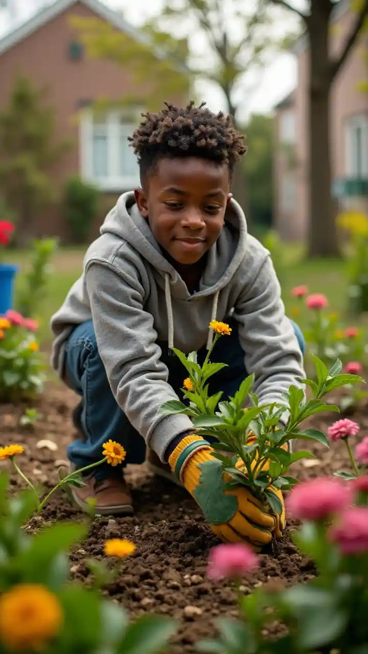 Un niño negro de 10 años con un desvanecimiento planta un árbol en un jardín comunitario, vestido con una sudadera con capucha y guantes de jardinería. Vecinos sonrientes y flores en flor lo enmarcan, sus cuidadosas excavaciones irradian esperanza y trabajo en equipo en un entorno cálido y urbano.