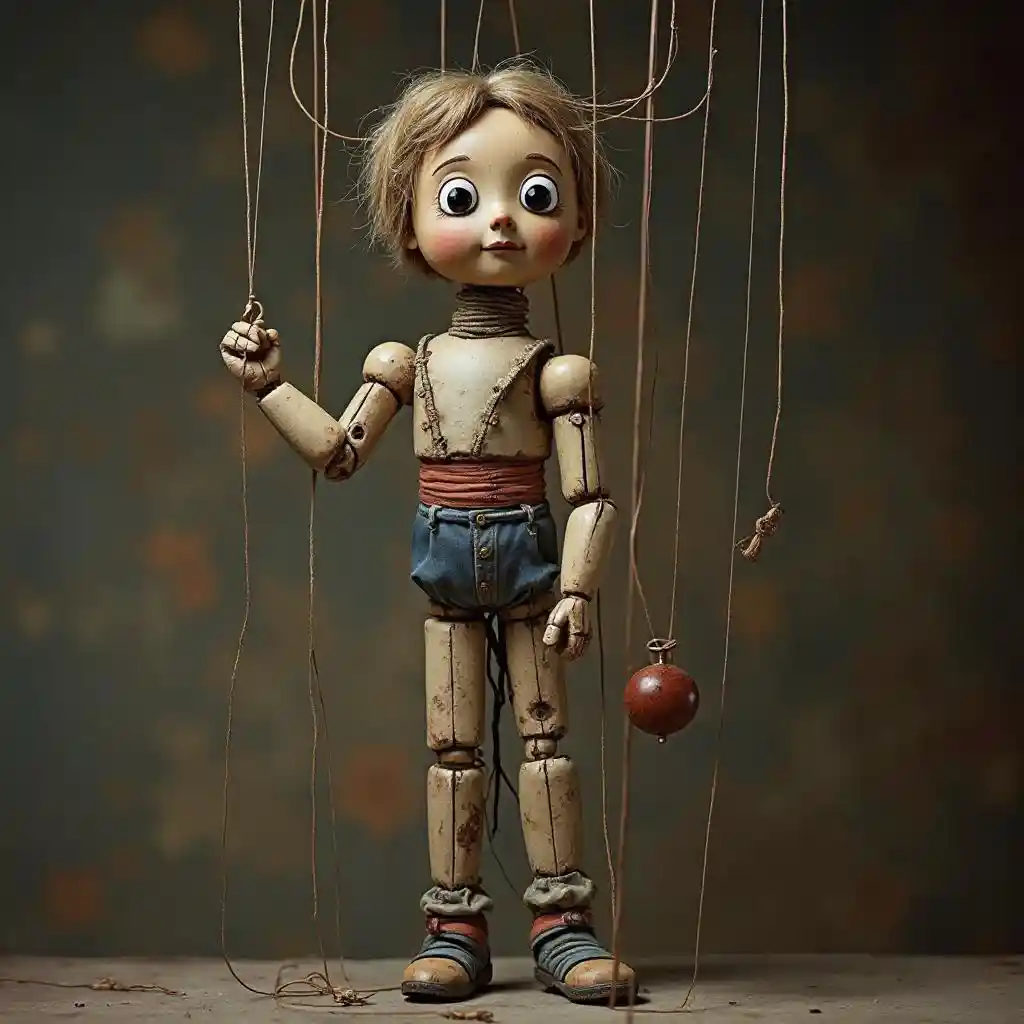 (La marioneta de un niño que hace movimientos complejos y está conectada por 45 a 50 cuerdas., La marioneta del niño tiene articulaciones elaboradas conectadas por 45 a 50 hilos