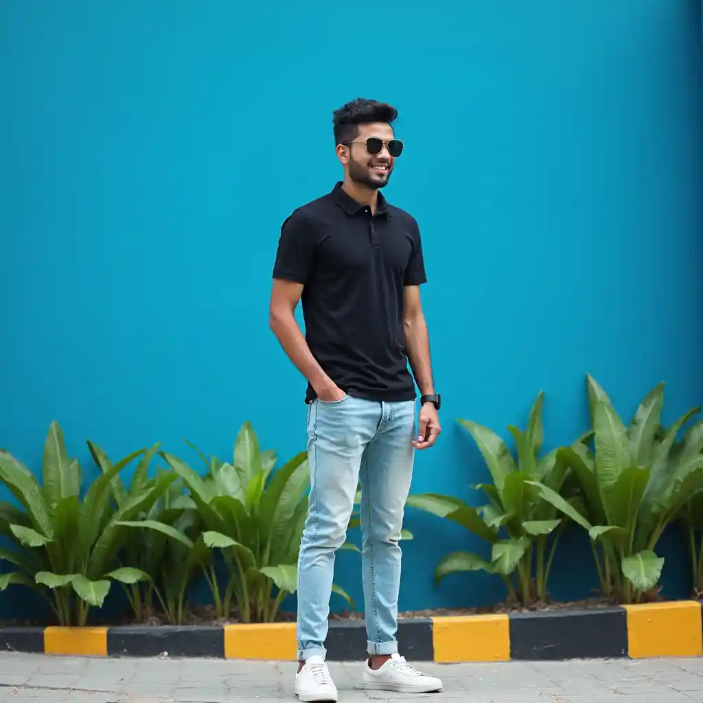 De pie con confianza contra un fondo azul vívido, un joven encarna un estilo moderno pero informal. Su polo negro complementa sus jeans de mezclilla claros, mientras que las elegantes gafas de sol agregan un toque de moda. Con una postura relajada, mira ligeramente hacia otro lado, y la sutil sonrisa en su rostro sugiere un comportamiento relajado. A su alrededor hay exuberantes plantas verdes que aportan un toque de color, que contrasta con las líneas afiladas de las estructuras cercanas, y el suelo presenta marcas de bordillos negras y amarillas alternas que mejoran la sensación urbana de la escena. El estado de ánimo general combina la confianza con un encanto relajado, perfectamente capturado en este moderno entorno al aire libre.