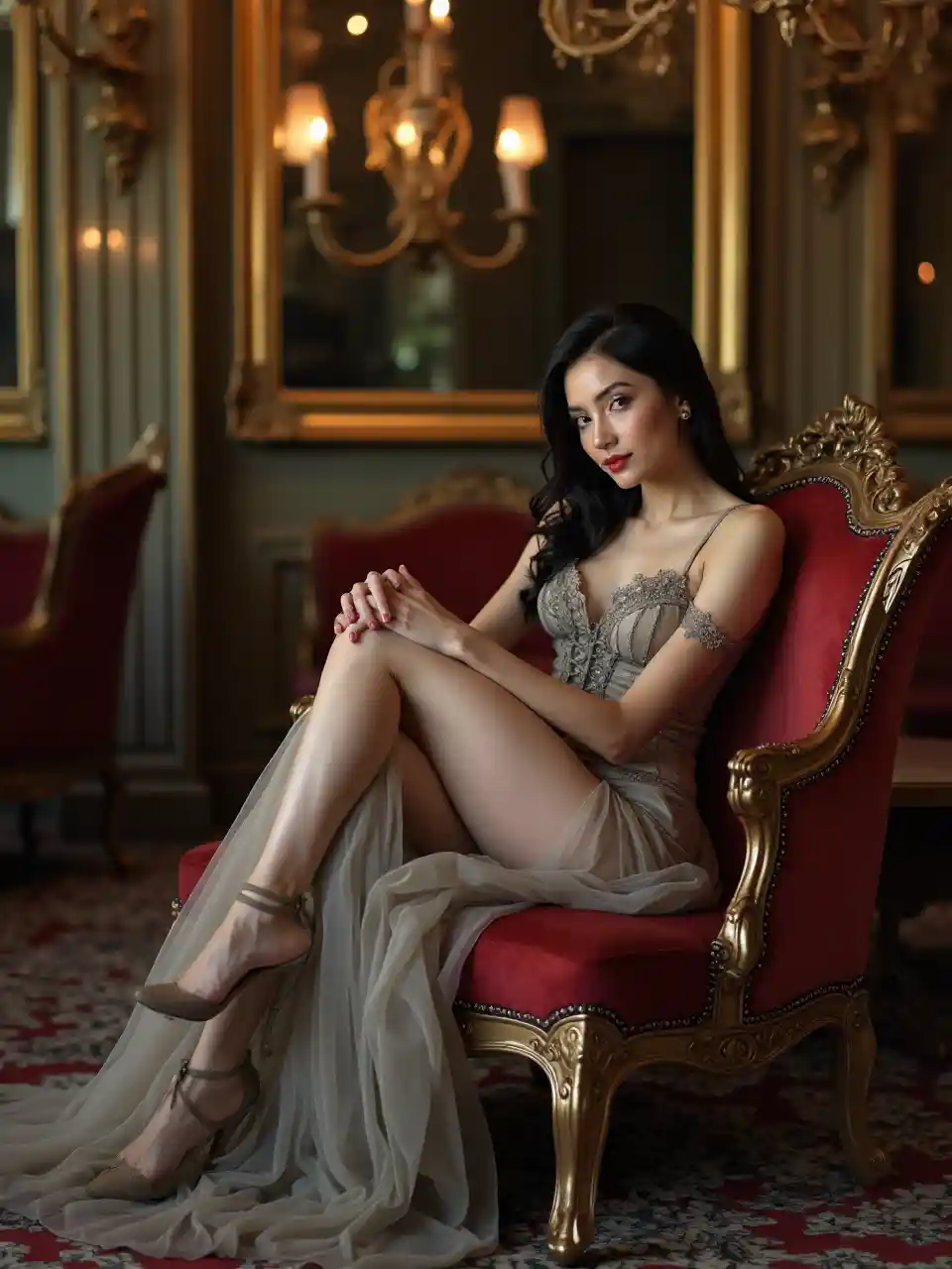 Reclinada en una tumbona de terciopelo en un salón barroco, una mujer asiática de unos 30 años cautiva con un vestido encorsetado con recortes de encaje. Espejos ornamentados y candelabros la enmarcan, sus piernas cruzadas y su diseño escotado irradian un encanto regio y una elegancia seductora en un entorno opulento e histórico.