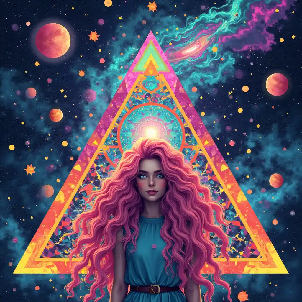 En una vibrante escena cósmica, Merry, una mujer caucásica delgada con cabello largo y rosado muy rizado y ojos azules, se encuentra en medio de una deslumbrante variedad de triángulos y maravillas matemáticas. Su cabello fluye como una nebulosa, fusionándose con un espectro de formas geométricas en tonos amatista y citrino. El triángulo de Sierpinski ocupa un lugar central, su intrincado patrón fractal de triángulos índigo y naranja crea un fascinante tapiz alrededor de Merry. Arriba, los azulejos de Penrose se despliegan en turquesa y magenta, su diseño no repetitivo simboliza infinitas posibilidades matemáticas. Una tira de Möbius gira en espiral alrededor de Merry, su superficie es un bucle sin fisuras de luz iridiscente. La paleta de colores es una vívida explosión de verdes neón, amarillos radiantes y magentas ricas, que evocan un paisaje onírico psicodélico. El estado de ánimo es de curiosidad infinita, ya que Merry encarna la armonía entre el caos y el orden en este universo matemático. Realizada con detalles meticulosos, la escena combina contornos nítidos con colores sin costuras, invitando a los espectadores a explorar este país de las maravillas surrealista. Estilo: Arte geométrico psicodélico con elementos surrealistas, inspirado en la geometría fractal y los azulejos de Penrose. Medio: collage digital. Recuento de caracteres: 1.052