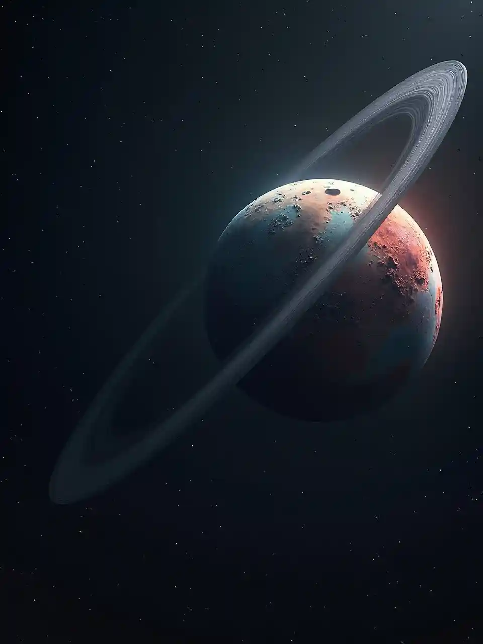 Un fondo de pantalla impresionante y ultra realista de un planeta lejano, capturado en máxima resolución con un detalle impresionante. La superficie del planeta muestra texturas intrincadas (cráteres, montañas y capas atmosféricas brillantes), lo que le da una apariencia verdaderamente realista. La inmensidad del espacio rodea el planeta, con un fondo negro profundo salpicado de estrellas distantes. Una fuente de luz suave ilumina la curvatura del planeta, creando un hermoso contraste entre la luz y la sombra. La paleta de colores es rica pero simple, con tonos naturales como azules profundos, rojos ardientes o blancos helados, dependiendo de las características del planeta. La composición general es limpia y minimalista, por lo que es perfecto como un fondo de pantalla de alta calidad, manteniendo una estética cósmica impresionante.