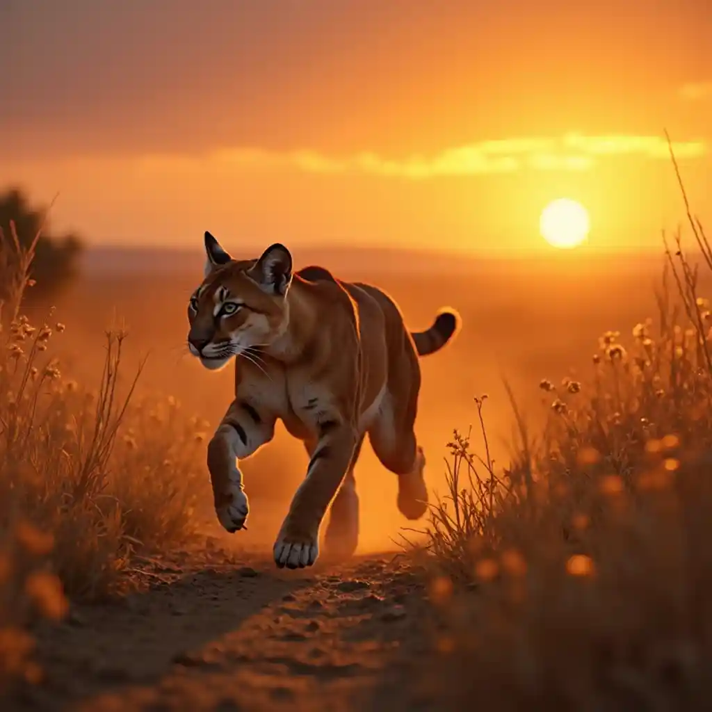 Un majestuoso puma, musculoso y ágil, corre dinámicamente a través de la sabana dorada bajo un vibrante sol poniente, emitiendo tonos cálidos y ámbar a través de la escena. Su elegante pelaje se fusiona a la perfección con la hierba alta y seca que ondula en la brisa de la noche, enfatizando su sigilo y poder. El cielo brilla con ricas naranjas y suaves rosas, creando una atmósfera cinematográfica de colores cálidos que resalta la belleza cruda de la vida silvestre. Las sombras se extienden a lo largo del paisaje, capturando un momento impresionante de supervivencia y persecución en la naturaleza, ideal para una imagen de alto impacto con un ambiente cautivador y enérgico.