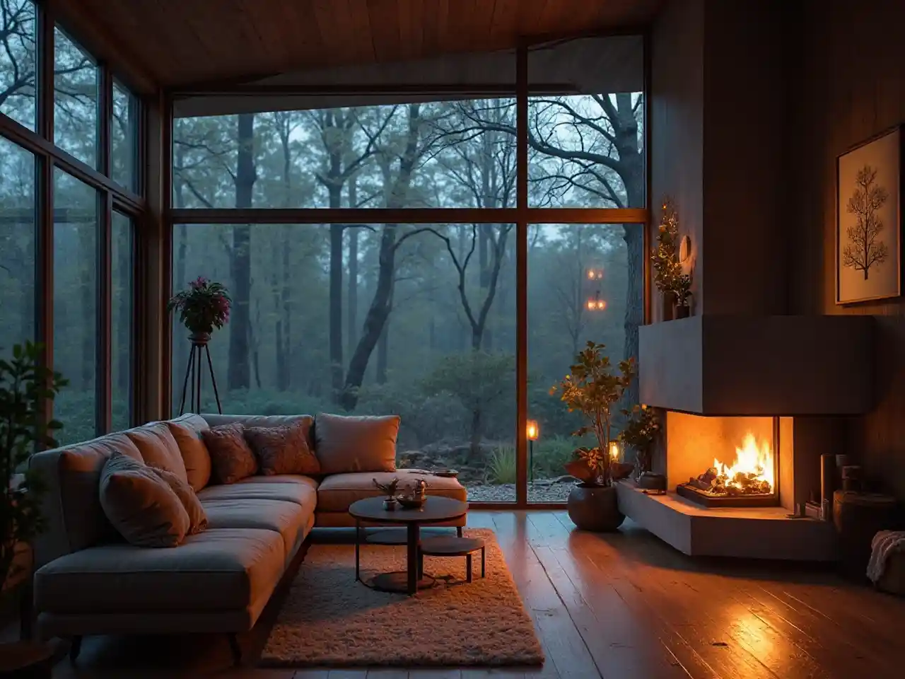 una noche acogedora en una gran sala de estar de piso a techo mientras llueve suavemente hacia el exterior. una chimenea cálida está en la esquina y los colores son todos tonos cálidos.