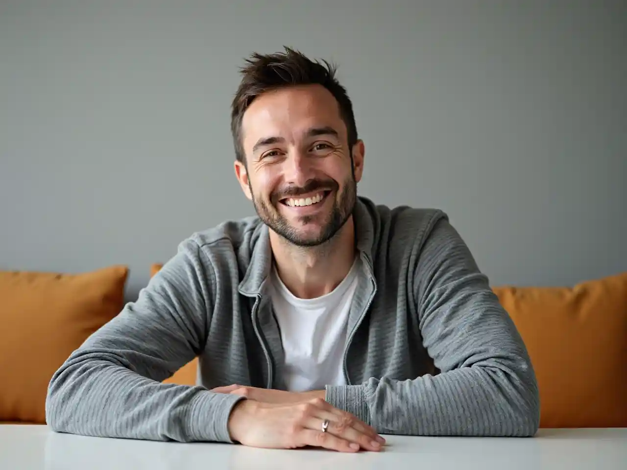 Un hombre parece relajado, sentado en una mesa, inclinado ligeramente hacia adelante con una sonrisa amistosa en su rostro. Tiene el pelo corto y oscuro y una barba clara, vestido casualmente con una chaqueta con cremallera a rayas grises sobre una simple camisa blanca. El fondo es predominantemente gris claro con un sofá naranja asomándose, insinuando un ambiente interior acogedor. Sus manos descansan casualmente sobre la mesa, que está desnuda excepto por una superficie lisa, lo que sugiere una atmósfera tranquila. La iluminación suaviza la escena, lo que se suma al ambiente acogedor y amigable capturado en este momento íntimo.