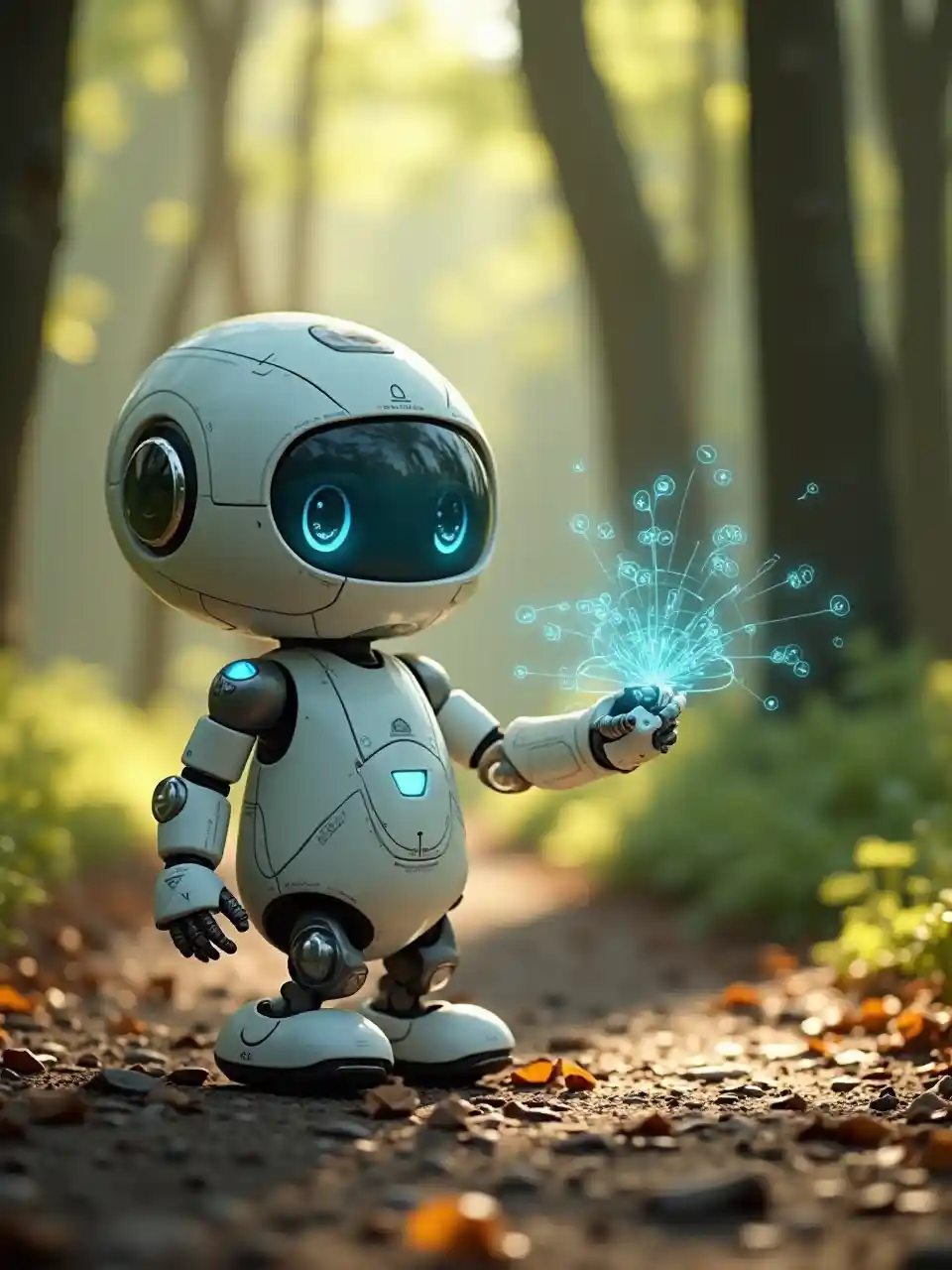 En medio de un sendero forestal moteado por el sol, se encuentra un encantador robot humanoide, con su forma lisa y redondeada adornada con un acabado desgastado, pero entrañable, blanco y azul claro. El robot, designado R8, presenta grandes ojos azules brillantes que transmiten una expresión de curiosidad y asombro, ya que extiende una mano para interactuar con un mapa holográfico proyectado ante él. La luz solar suave y difusa se filtra a través de los árboles circundantes, creando una atmósfera pacífica y acogedora que contrasta con la tecnología futurista que se muestra en la palma del robot. La escena captura una mezcla armoniosa de naturaleza e innovación, sugiriendo una narrativa de exploración y descubrimiento en un mundo donde la tecnología y el medio ambiente coexisten a la perfección.