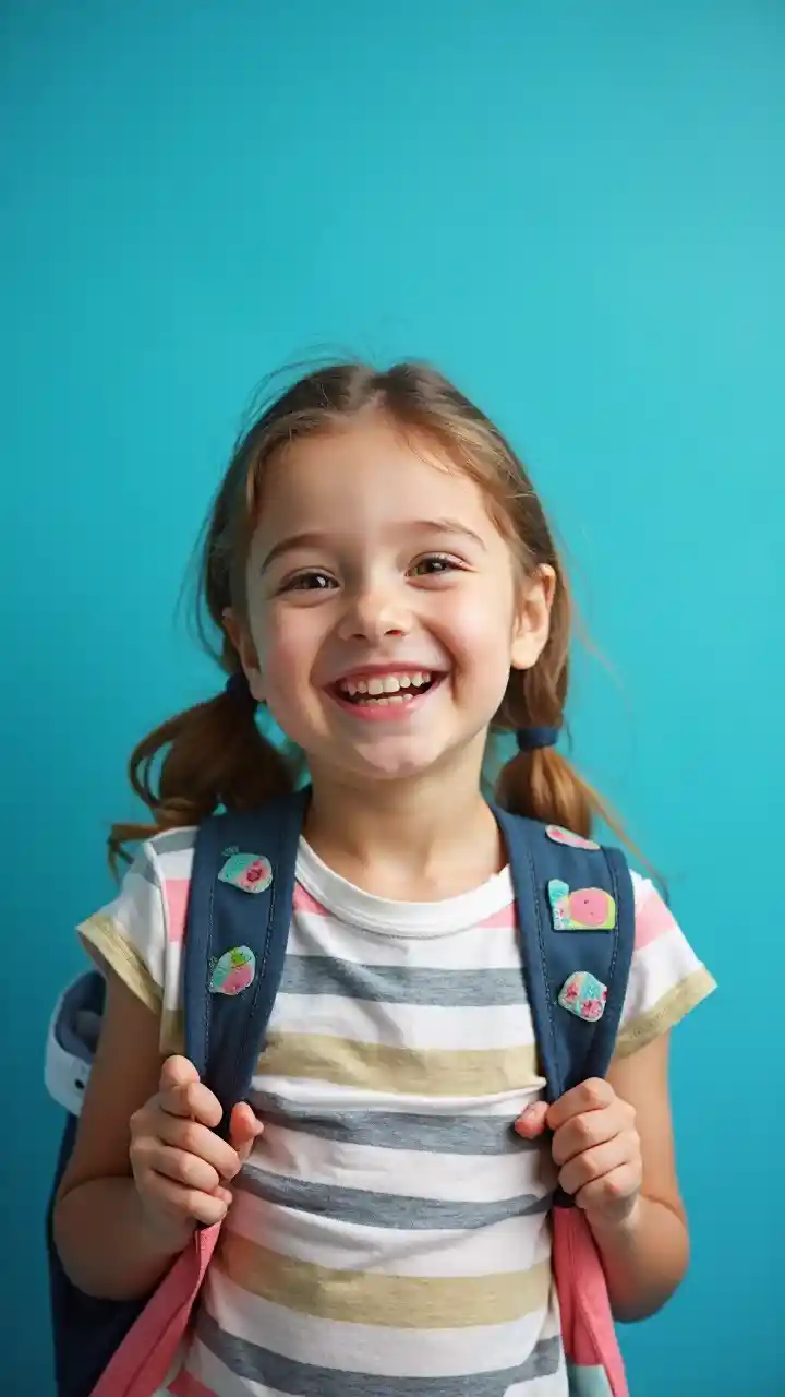 foto niña feliz que va a viajar, niña linda, camiseta a rayas, fondo azul, arpers bizarros, portada, foto en la cabeza, hiperrealista