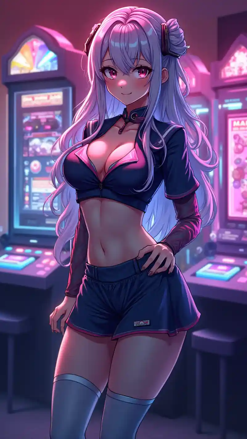 Imagen vertical a gran escala de una chica anime Ultra HD, sorprendentemente hermosa y juguetona, iluminada por luces de neón, parada en una sala de juegos interior futurista con máquinas recreativas, vistiendo un uniforme cyber JK con una falda corta y medias hasta los muslos, su cabello largo brillando con reflejos de neón y una sonrisa juguetona, ojos brillantes y anchos, piel brillante, paleta de colores rosa y azul neón, rasgos nítidos, maquillaje audaz, vibraciones enérgicas y vanguardistas, iluminación dinámica con un brillo suave, destacando su cautivador y bien definido pecho con un sutil escote, y piernas largas y tonificadas con una postura segura, irradiando carisma y encanto.