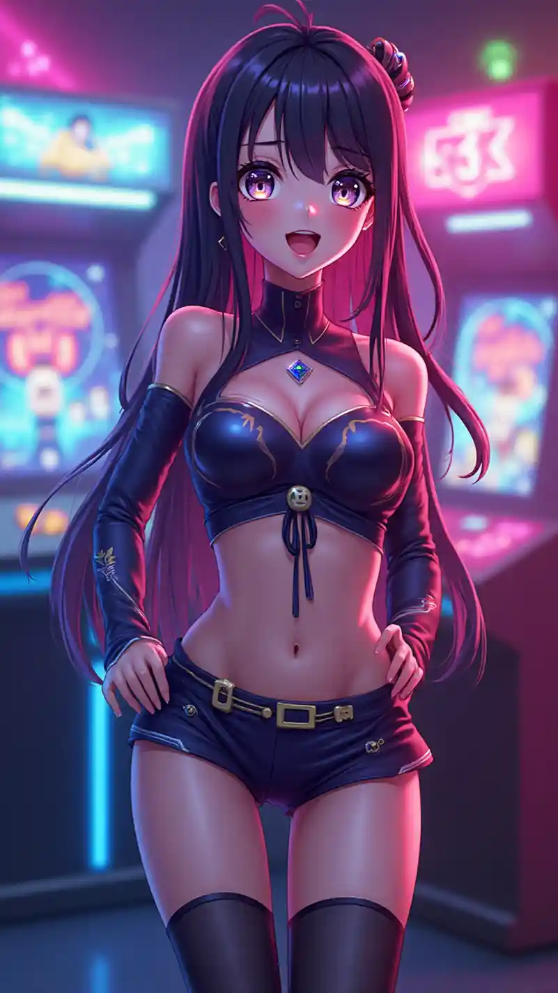Imagen vertical a gran escala de una chica anime Ultra HD, radiantemente impresionante y juguetona, iluminada por luces de neón, de pie en una sala de juegos interior futurista con máquinas recreativas, vistiendo un uniforme cyber JK con una falda corta y medias hasta los muslos, su cabello largo brillando con reflejos de neón y una sonrisa juguetona, ojos brillantes y anchos, piel brillante, paleta de colores rosa y azul neón, rasgos delicados, maquillaje audaz, vibraciones enérgicas y vanguardistas, iluminación dinámica con un brillo suave, enfatizando su elegante, pecho bien definido con un escote sutil, y piernas largas y tonificadas con una postura segura, irradiando carisma y encanto.