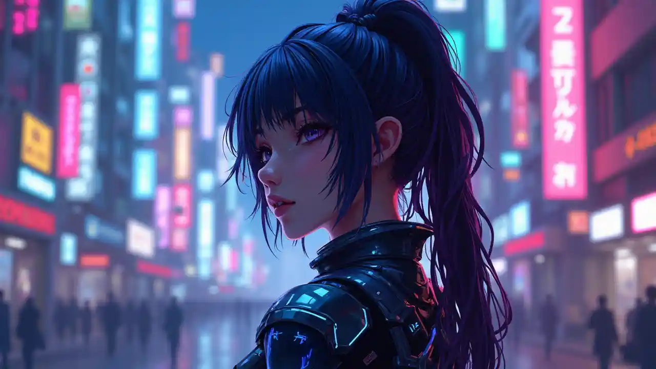 PaisleyCrea una chica como Cyberpunk con pelos morados oscuros, balck y azules y una armadura brillante. Shinjuku Tokio detrás de ella