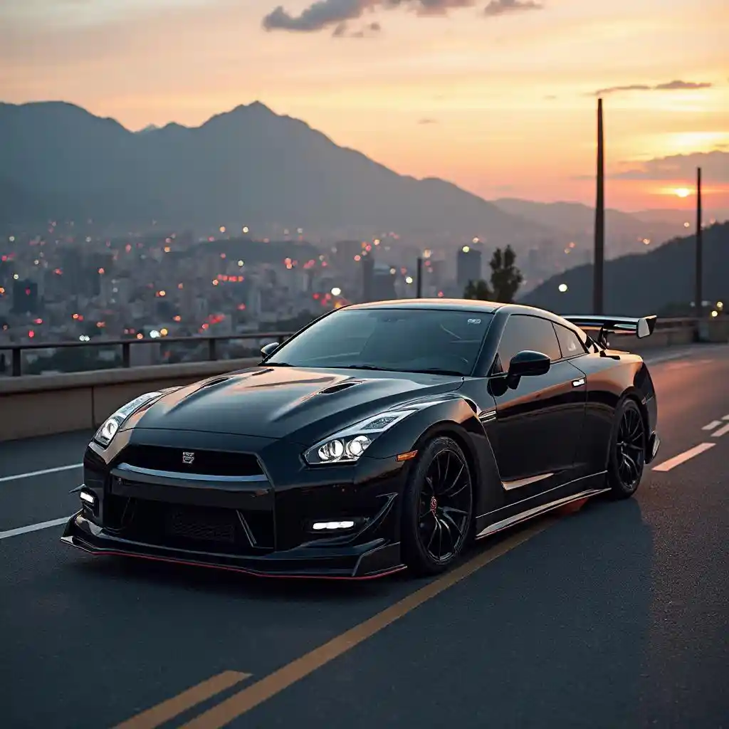 ruslanaNissan gtr r35 negro brillante en la ciudad neom cyberpunk al atardecer con grandes montañas en el fondo