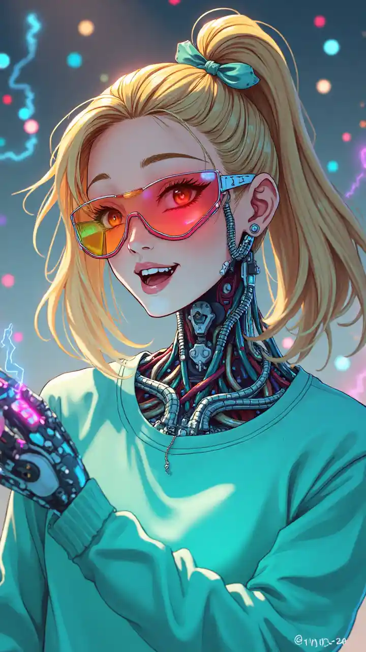 1girl, solo, medio cyborg con cola de caballo alta y rubia, con gafas de sol futuristas con visera de arcoíris y una sudadera verde azulado clara. Cuello robótico intrincado visible y componentes faciales con cables de colores. Expresión alegre, estética pop cyberpunk, manos robóticas, sangre de truenos, enfoque en primer plano, anime de los 90, trueno, electricidad brillante al frente, un brazo robótico extendido, mirando la luz, el arco, el arco de cabello, obra maestra, la mejor calidad, gran calidad, muy hermoso, alta resolución,, score _ 9, score _ 8 _ up, score _ 8, highres, absurdres,