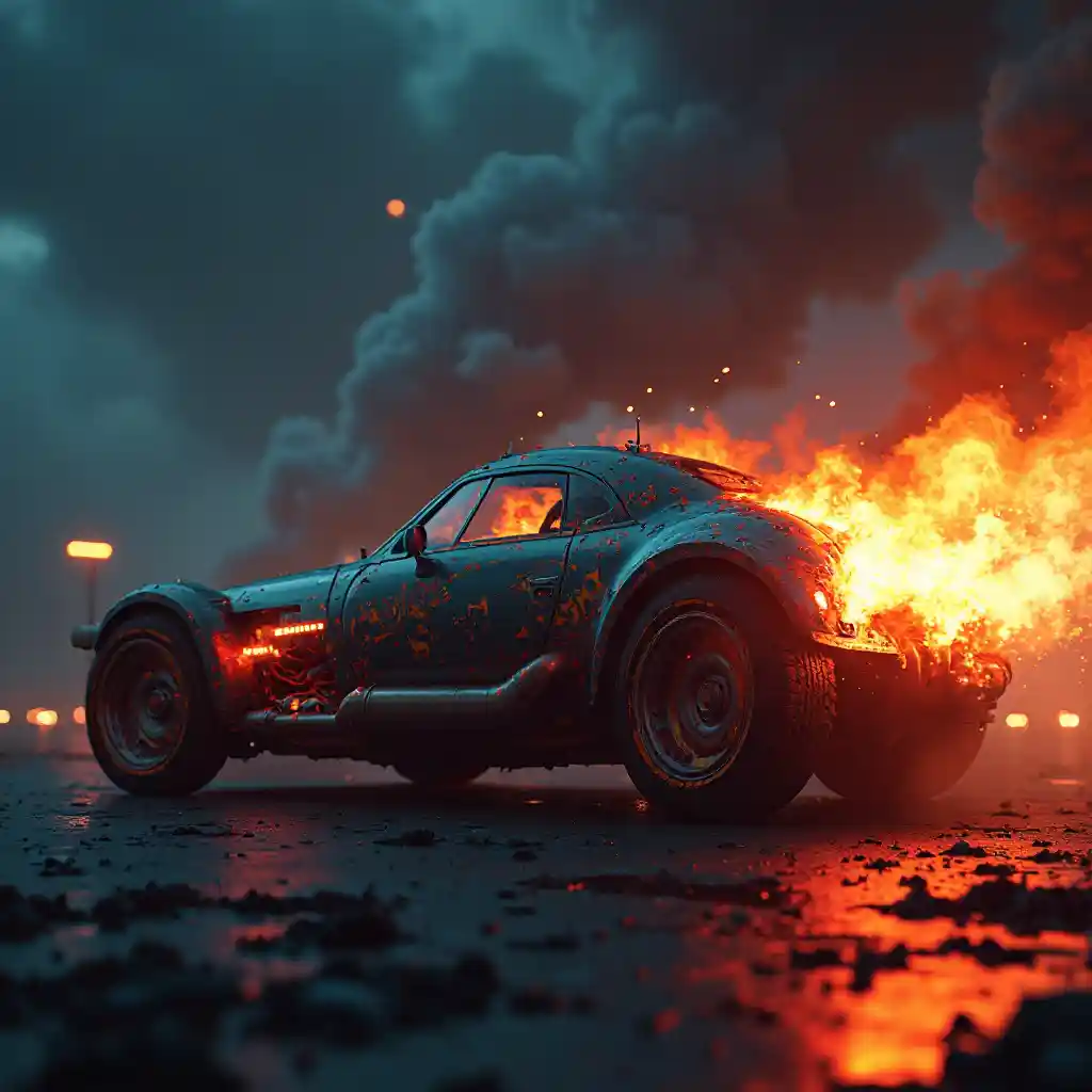 future spaceship cyberpunk hot rod with dramatic fire in back, neon lights, no wheels, nothing in background