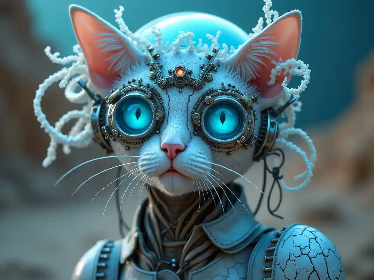 Tocado de medusa bioluminiscente de gato cyborg etéreo. Las gafas Steampunk se mezclan con tentáculos translúcidos. La piel de porcelana agrietada se encuentra con escamas iridiscentes. Los implantes mecánicos y los delicados zarcillos se entrelazan. Características humanas con brillo de otro mundo. Los tonos acuáticos de ensueño contrastan con el metal meteorizado. Los ojos reflectantes capturan mundos invisibles. La bioluminiscencia suave se encuentra con el duro telón de fondo del desierto. Fusión de orgánico y sintético, antiguo y futurista. Texturas hiperdetalladas, atmósfera surrealista.