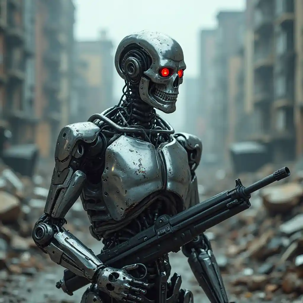 Endoesqueleto de esqueleto de cromo de carácter cyborg totalmente blindado pecho diminutos ojos rojos brillantes con dientes humanos inserto circular de línea de mandíbula cuadrada en el lado de la cabeza cables y cables unidos dentro de los lados de la cavidad torácica accesorios de brazo de cromo articulan articulaciones gruesas de cromo médula espinal chasis torácico mano agarre fusil de asalto negro futurista con mira telescópica proyectiles láser que emiten aspecto intimidante dentro del apocalipsis de la ciudad futura Metrópolis destruyó concreto y acero coches chatarra enterrados que cubren el paisaje de fondo pesadilla épica obra maestra ultra realista estilo Terminator intenso atmósfera nublada