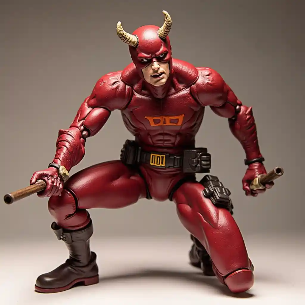 Una figura detallada de Daredevil con un disfraz rojo con una máscara con cuernos, agachado en una pose dinámica contra un fondo liso, sosteniendo bastones con un emblema de "DD" en el pecho y bolsas utilitarias en los muslos.