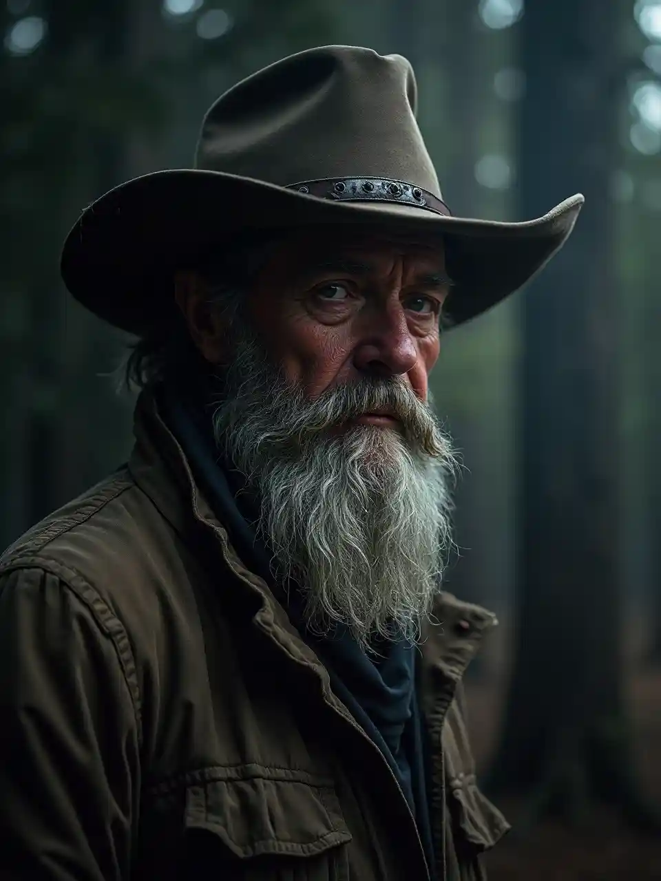 viejo vaquero con barba larga, escena oscura, atmósfera oscura, toma épica, detalles nítidos