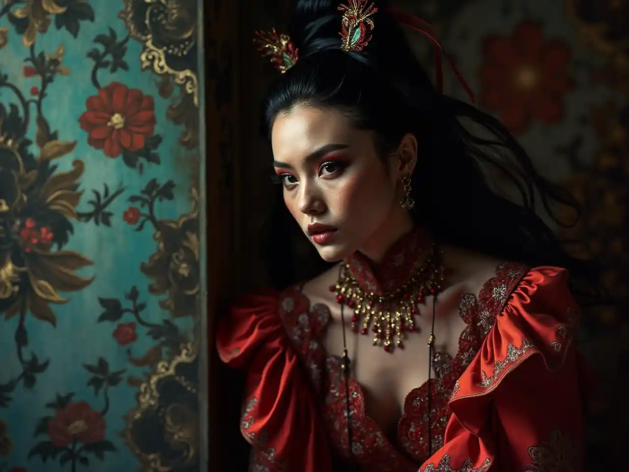 Fotografiado desde abajo de un cuerpo completo. estilo editorial de moda {Foto HDR de {terror-themed {Impresionante modelo ming xi. gran peinado, medio en sombra, en pose, iluminación natural, iluminación de borde, usando un adornado e impresionante vestido sofístico de onda fluida inspirado en Madame Grès, colorido maquillaje extremo newbarroco de benjamin puckey, altamente detallado, detalle de grano de piel, fotografía de paolo roversi}. espeluznante, inquietante, oscuro, espeluznante, de suspenso, sombrío, altamente detallado}. Alto rango dinámico, detalles vivos y ricos, sombras y reflejos claros, contraste realístico, intenso y mejorado, altamente detallado