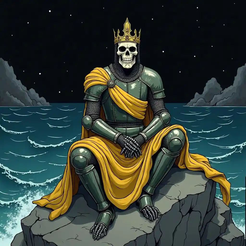 Un caballero que lleva una faja amarilla. Se sienta en una montaña de diamantes. Detrás de él está el mar. El cielo es negro y hay estrellas nocturnas. El hombre lleva una máscara de esqueleto. El mar es turbulento. El hombre lleva una corona de esqueleto. Lleva un atuendo real.