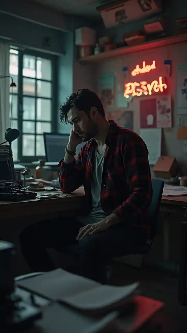 Un estudio de oficina con poca luz que presenta @ a3pByb2GQ7qK5Aid9WES, está en el fondo del lado derecho de la imagen, se ve cansado y agotado, mirando hacia el escritorio, sosteniendo su cabeza entre sus manos. Vestido con una camisa a cuadros, roja y negra, desabrochada, con las mangas empujadas hacia arriba con una camiseta interior gris. El espacio está repleto de papeles dispersos, un viejo escritorio de madera y una máquina de escribir vintage, creando una atmósfera de soledad y nostalgia Se puede ver un letrero de neón parpadeante "el papá abollado" centrado en la imagen, a través de una ventana, agrega un toque de color a los tonos apagados. El ángulo de la cámara captura la escena desde una perspectiva baja y amplia, enfatizando la silueta del personaje contra la luz, con un enfoque suave en el fondo para mejorar la sensación de profundidad e intriga.