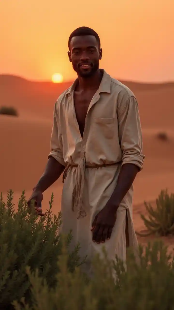Cuidando un jardín de hierbas del desierto, un hombre negro de 35 años brilla con una túnica suelta. Las dunas de arena y una puesta de sol carmesí lo enmarcan, su cuidado suave y su presencia constante exudan resiliencia terrenal y encanto tranquilo en un paisaje austero y vibrante.
