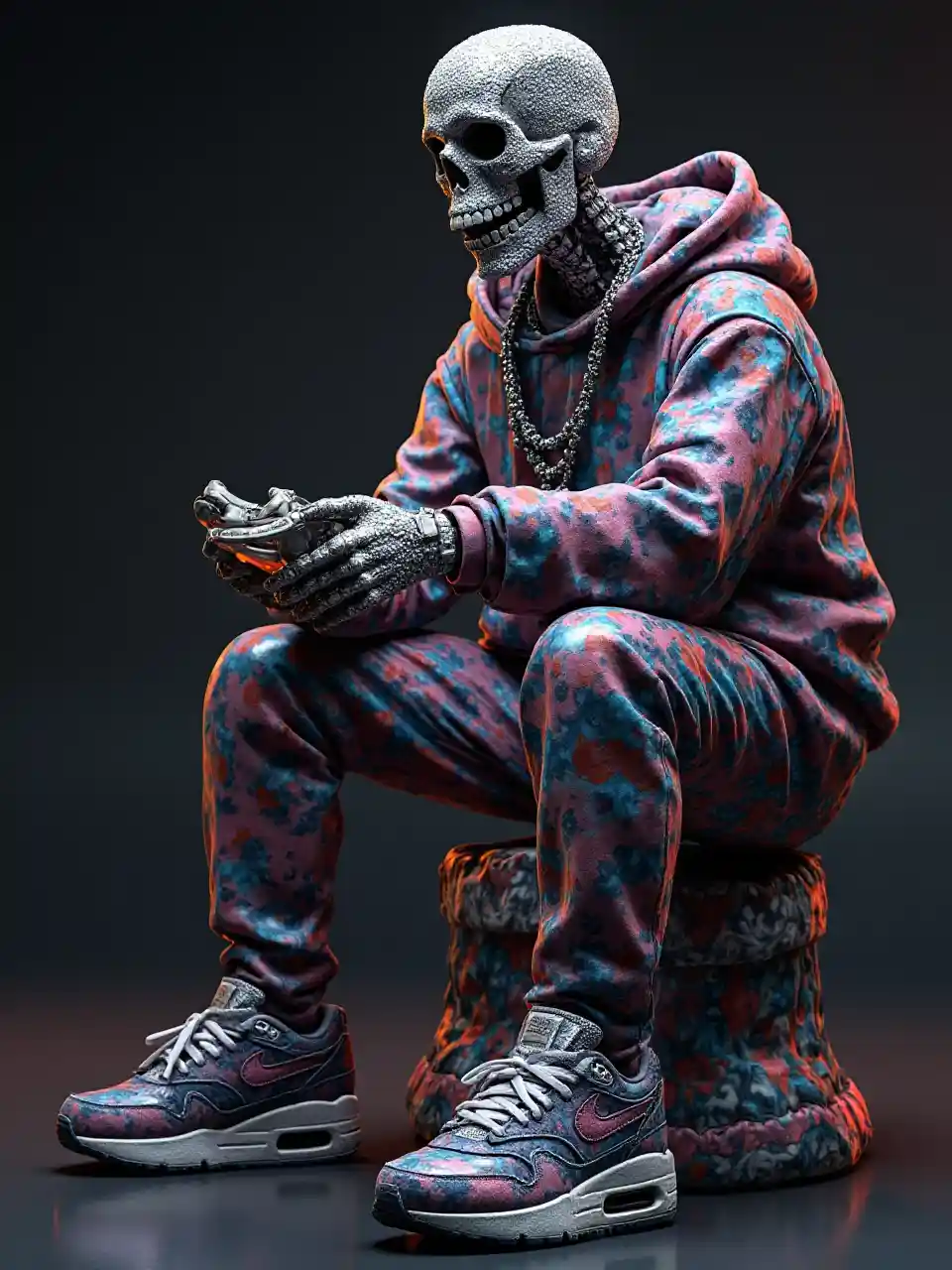 Modelo 3D de motor irreal render de un retrato de cuerpo completo de VVS Diamond Cubierto con Diamond Cluster Gamer Skeleton personaje como una escultura romana de metal brillante jugando videojuegos cubiertos de graffiti brillante, vistiendo ropa de alta costura y Nike Air Max 1 '86 OG "Doernbecher" Zapatos, gran cadena de diamantes, grandes dientes de diamantes, desgaste urbano de la calle. estudio negro perfecto reflectante Iluminación con luz de borde brillante alto contraste ultra agudo