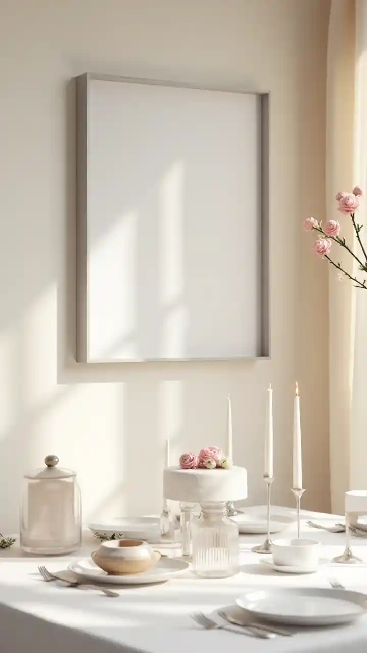 Una acogedora escena de maqueta de comedor con un marco rectangular blanco de 50x70 cm con un borde metálico delgado en un acabado plateado cepillado. El marco está montado en una pared lisa de color crema, colocada centralmente sobre una mesa de comedor rectangular. El marco se ve de frente, paralelo a la pared, proporcionando una vista completa y sin obstrucciones del marco. La mesa de comedor está cubierta con un simple mantel blanco, creando un telón de fondo limpio y elegante. En la mesa, hay un arreglo de elementos esenciales para comer y decoración: en el centro, un pequeño pastel redondo decorado con flores rosadas se encuentra en un plato blanco. A la izquierda del pastel, una jarra de café plateada y un jarrón de vidrio vacío contienen una sola flor rosa. A la derecha, un segundo jarrón de cristal con un delicado ramo de flores rosas y blancas. Flanqueando el pastel hay cinco velas blancas altas y delgadas en candelabros plateados, sus llamas encendidas, agregando un cálido resplandor al escenario. La mesa está preparada para dos personas con platos de cerámica blanca, tenedores y cuchillos, así como una taza de té blanca y un platillo en el lado derecho. Una pequeña rama con hojas secas o ramitas cuelga decorativamente en la esquina superior derecha. Las cortinas de color beige puro en el lado derecho de la imagen permiten que la luz del sol se filtre, creando sombras suaves y una atmósfera cálida y acogedora