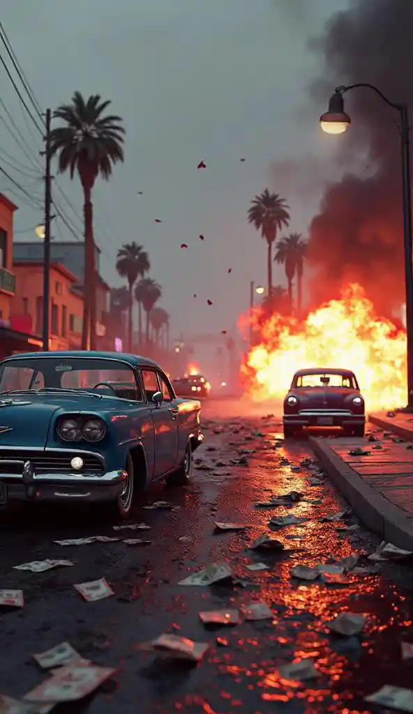 Calles sucias de Los Santos en caos: tiroteo de pandillas en medio de graffiti de neón, autos que explotan, escombros voladores, lluvia de billetes manchados de sangre pegados al asfalto, columnas de humo