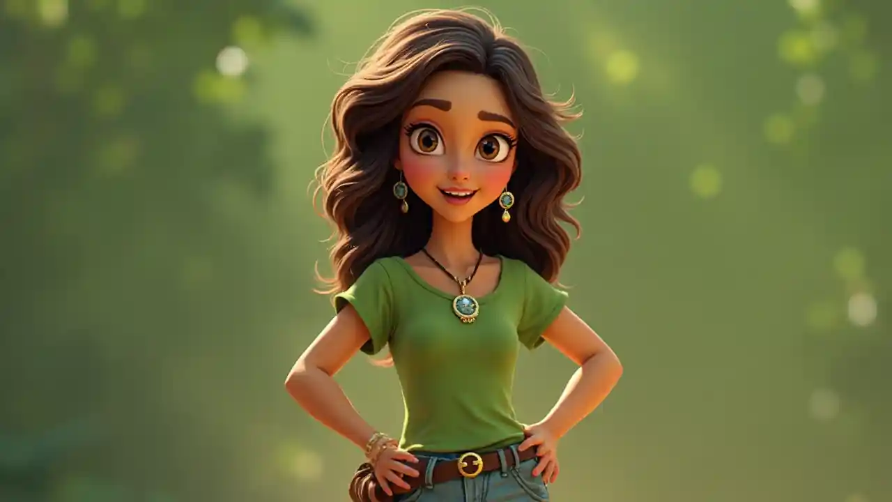 IsabellaPersonagem feminina, pele morena clara, estilo disney pixar, cabello encaracolado comprado, aventureiro, com camiseta e boné verde, corpo inteiro