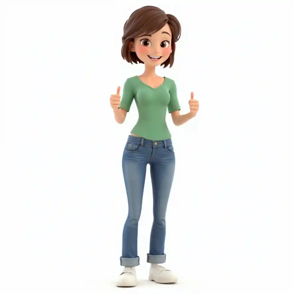 Morena femenina en 3D, cabello corto, pantalones de mezclilla, zapatos blancos, camisa verde lisa, cuerpo completo, fondo blanco liso, pulgar izquierdo hacia arriba, sonriente, estilo Disney Pixar