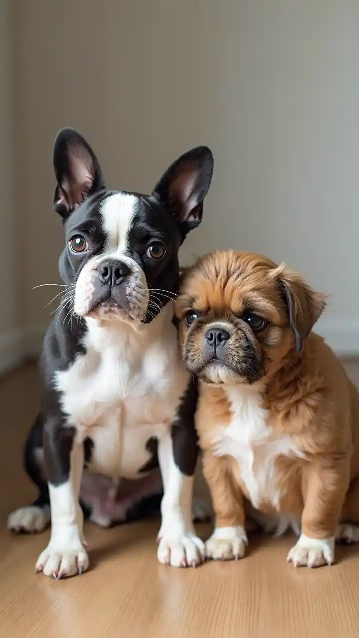 Bulldog francés blanco y negro junto con un shih tzu marrón y blanco