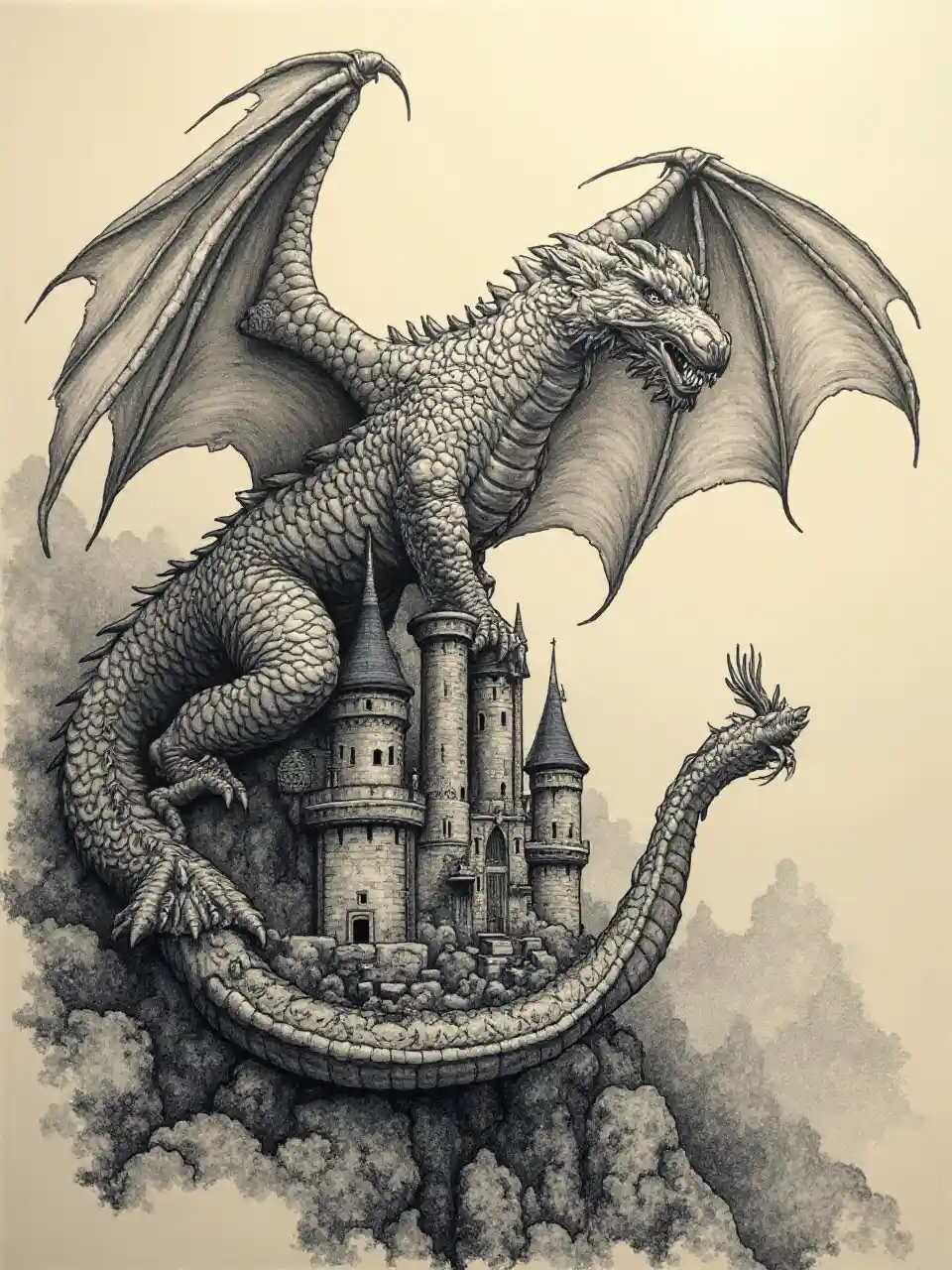 Savannahun dragón volando por un castillo. vector altamente detallado para grabado láser
