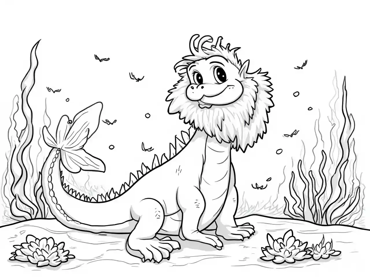 Leviun lagarto dragón barbudo bajo el mar, con la sirenita a su lado, página de libro para colorear en blanco y negro para niños estilo lindo de dibujos animados