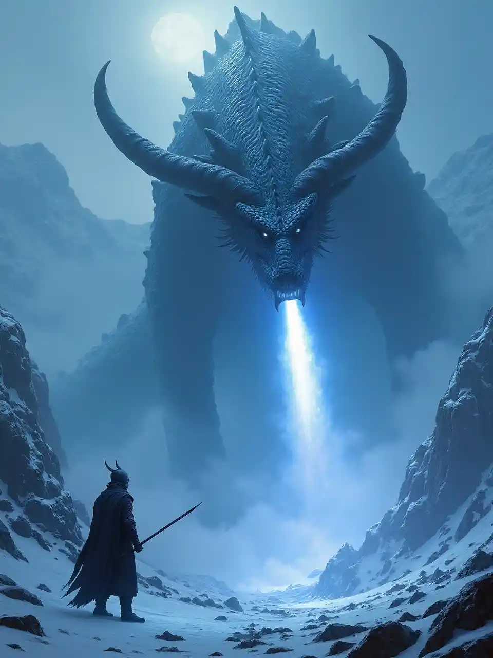 En medio de un paisaje dramático y helado, un dragón colosal se eleva sobre una figura solitaria con cuernos de bufallo en la cabeza, vestido con una armadura oscura, que emana un aura de peligro y poder. El dragón, con sus escamas brillando con tonos índigo profundo y negro, desata un brillante rayo de energía desde su boca, iluminando la nieve circundante y las montañas cubiertas de nubes en una mezcla de luces y sombras espeluznantes. Los picos distantes están envueltos en niebla, lo que sugiere una tormenta inminente, mientras que el primer plano revela al guerrero agarrando una lanza, preparado para desafiar a esta temible bestia. Los colores contrastantes de la escena (azules fríos y blancos crudos contra la figura oscura) aumentan la tensión, capturando un momento lleno de anticipación y la batalla tácita entre el hombre y el dragón. La atmósfera general resuena con un sentido de confrontación épica y grandeza mítica, atrayendo a los espectadores a un mundo de fantasía heroica y aventura.