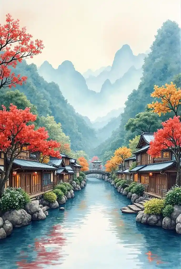 stxphPaisaje japonés del centro de la ciudad, ((acuarela: 1.2, manchas de acuarela: 1.2, contorno grueso, toque de libro ilustrado)), Mundo de sueños dibujado a mano, obra maestra, mejor