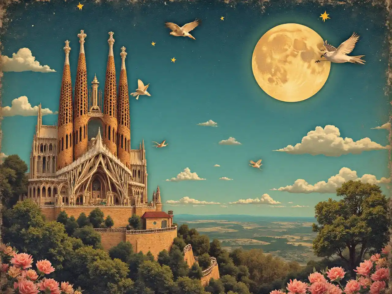 Arte recortado, vintage, arte surrealista de estilo collage que representa paisajes de ensueño, la Sagrada Familia, imaginativo, fantástico, de otro mundo, elementos de collage, fotos vintage, postales retro, objetos surrealistas y flotantes con símbolos cristianos comunes, composición intrincada, perspectivas en capas, atmósfera misteriosa, cielo bajo la luz de la luna, estrellas, nubes, detalles ocultos, imágenes enigmáticas, imágenes subconscientes.