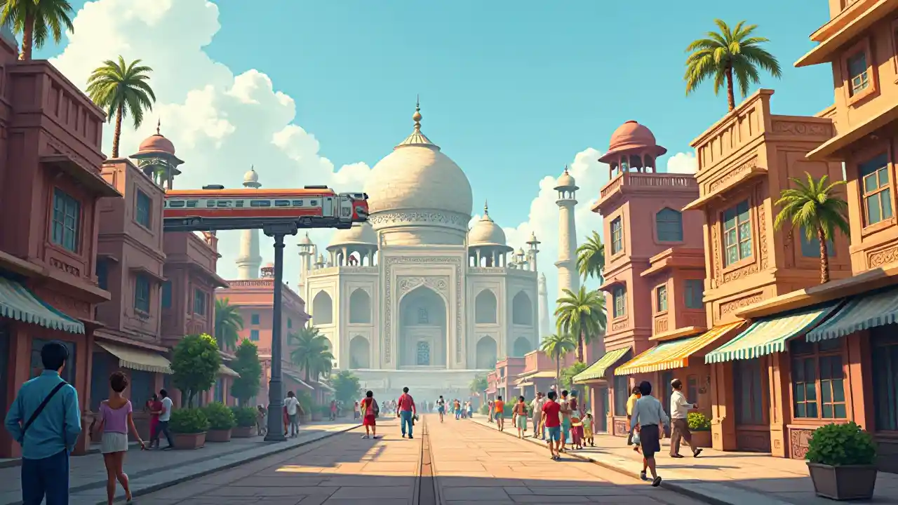 una calle de dibujos animados de una ciudad famosa de la India con como Taj Mahal, con gente caminando y un tren en las vías por encima de ellos, Ella Guru, futurismo, imagen promocional, arte del cartel