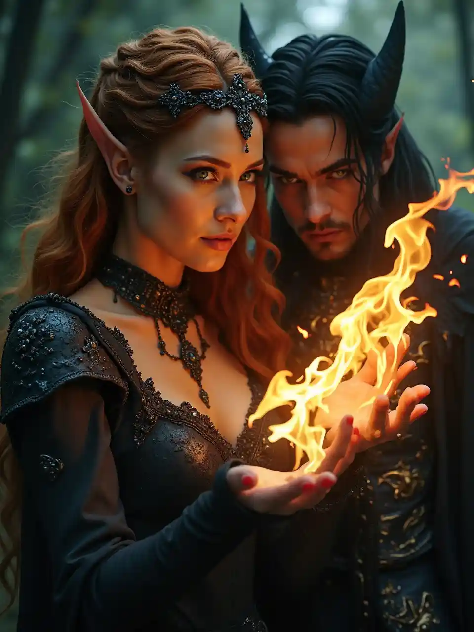 Mujeres elfas manipulando el fuego telepáticamente con sus manos, cautivadores ojos verde oliva, cabello castaño suelto, atuendo de temática gótica, ambiente oscuro y místico, poderosa energía que irradia de sus gestos, junto a un rey elfo oscuro con cabello negro azabache, penetrantes ojos grises de acero, vestido con una armadura gótica ornamentada, sombras dramáticas e iluminación etérea, atmósfera encantadora y ultra detallada.