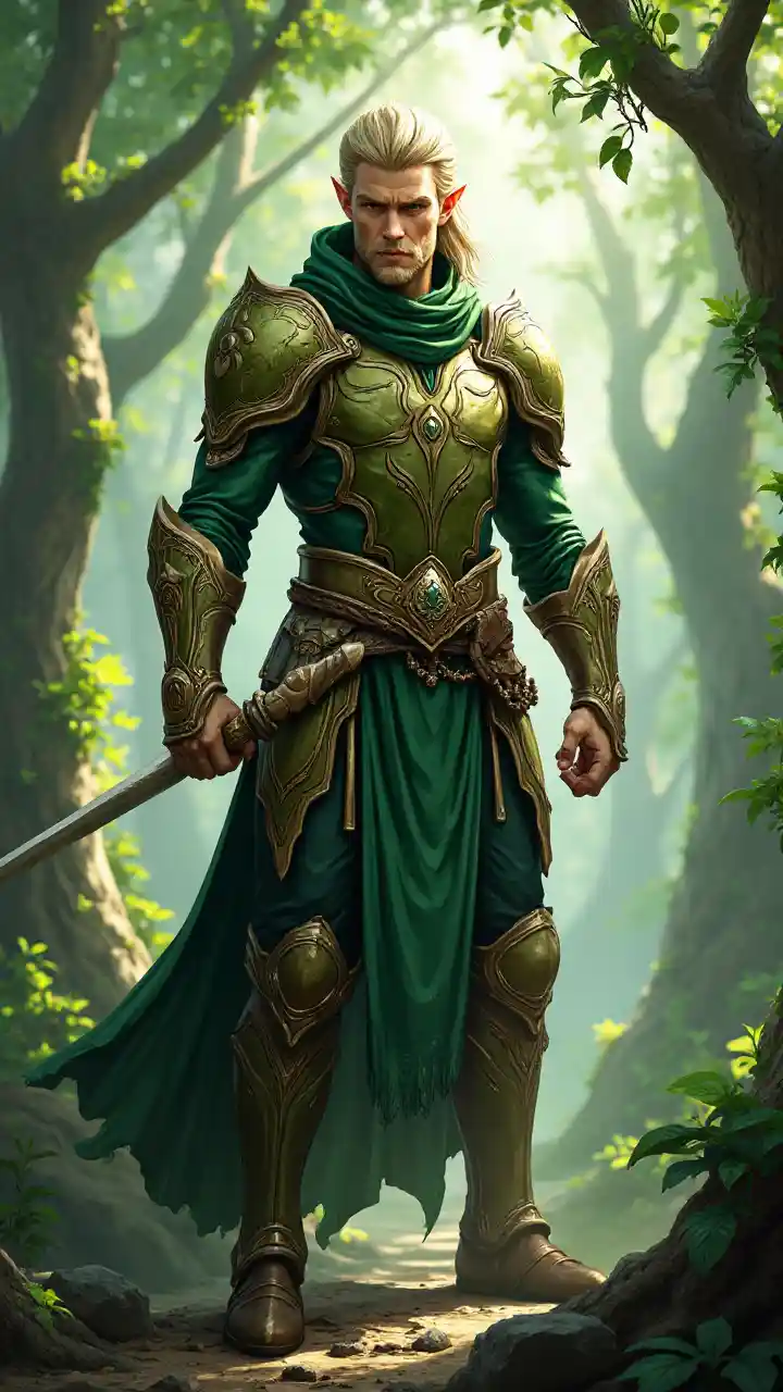 "Diseño de personaje de elfo masculino, guerrero elfo ferozmente protector, armadura intrincada que combina elementos naturales, tonos verdes y terrosos vibrantes, erguido en una majestuosa ciudad de árboles elfos, luz solar hipnótica que se filtra a través de las hojas, detalles cautivadores de la arquitectura antigua que lo rodea, alta calidad, ilustración ultra detallada, que transmite fuerza y nobleza".